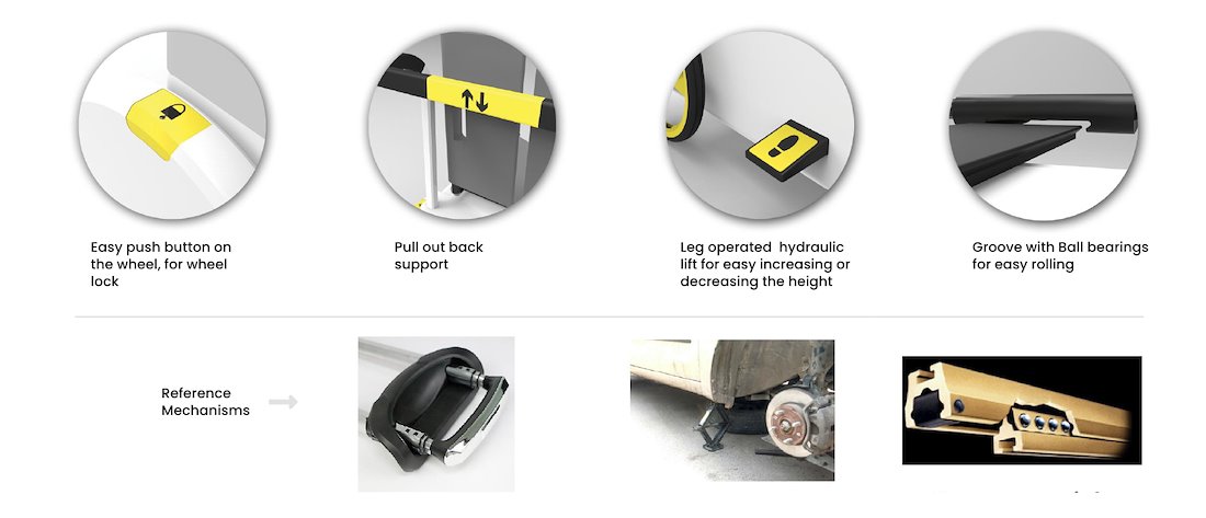 So, I redesigned the wheelchair with an integrated sliding scoop stretcher which folds and becomes a seating as well for the wheelchair. The design is done by considering the physical strain of the caregivers at homes.