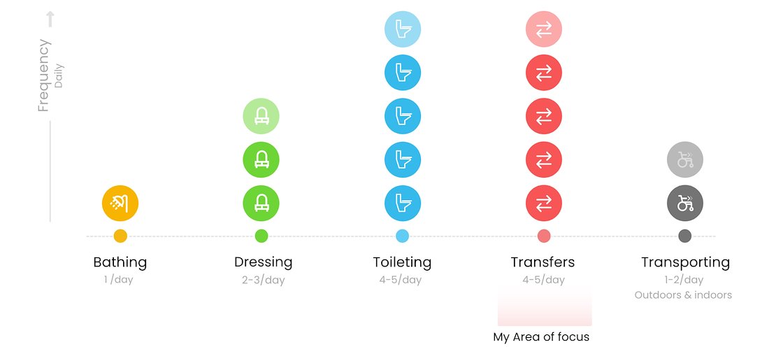 The focus area for me is transferring paralysed people at home from bed to wheelchair & vice versa, which affects the mental & physical well being of the caregivers. Let's see the transferring scenario with the problems faced by caregivers below in the diagram.
